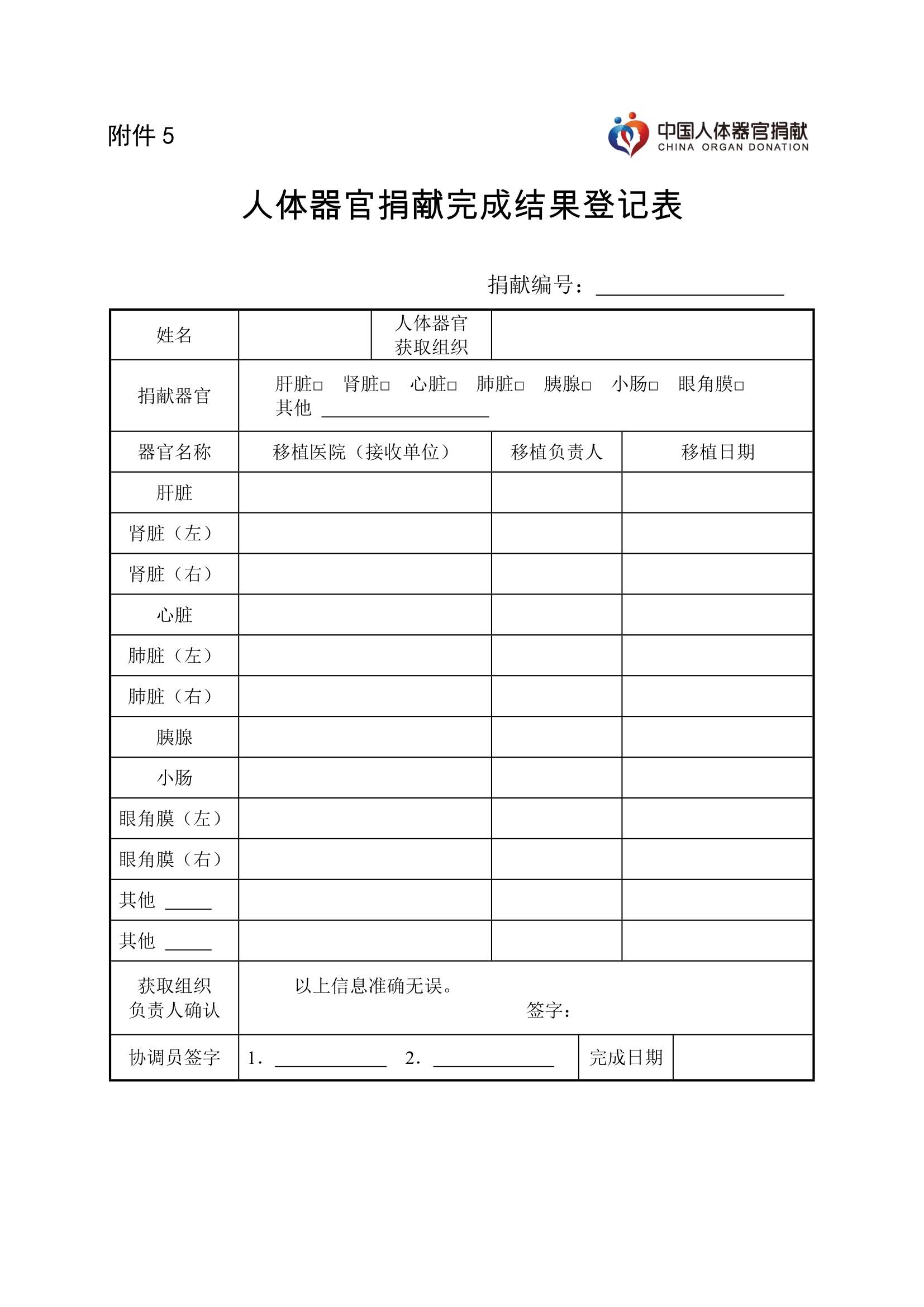 第二十条 获取完成后,人体器官获取组织填写《人体器官捐献完成结果登记表》(附件5)器官分配去向信息,人体器官获取组织负责人签字,协调员审核相关信息准确无误后签字确认。