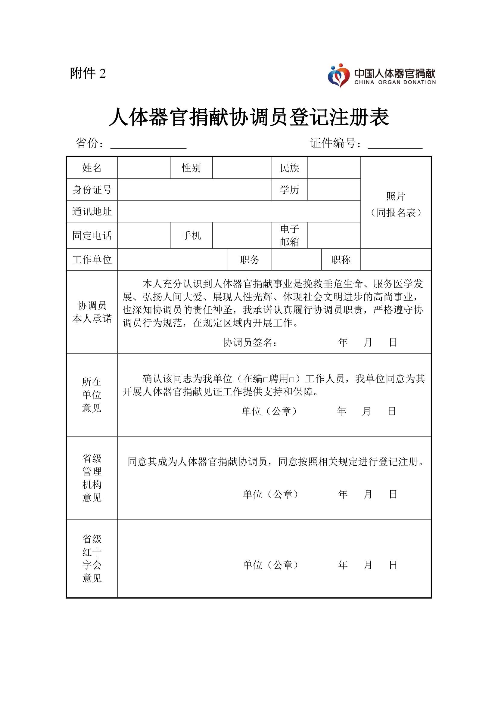 (三)拟注册人员取得培训合格证书后,由本人填写《人体器官捐献协调员登记注册表》(附件2),经所在单位同意,由省级红十字会审核批准,进行登记注册;