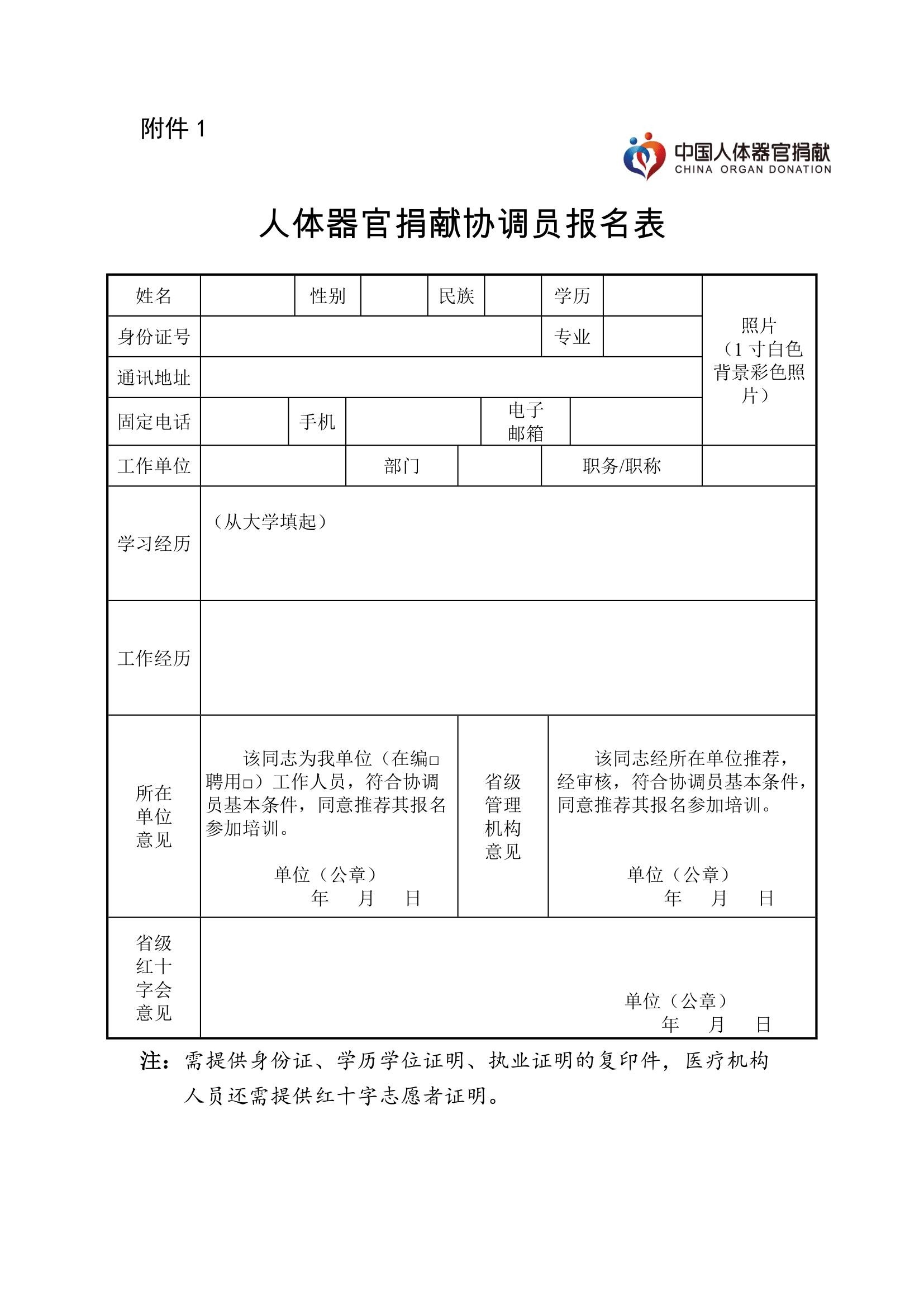 (一)经所在单位推荐,拟注册人员填写《人体器官捐献协调员报名表》(附件1),由省级红十字会审核通过后报国家管理中心;
