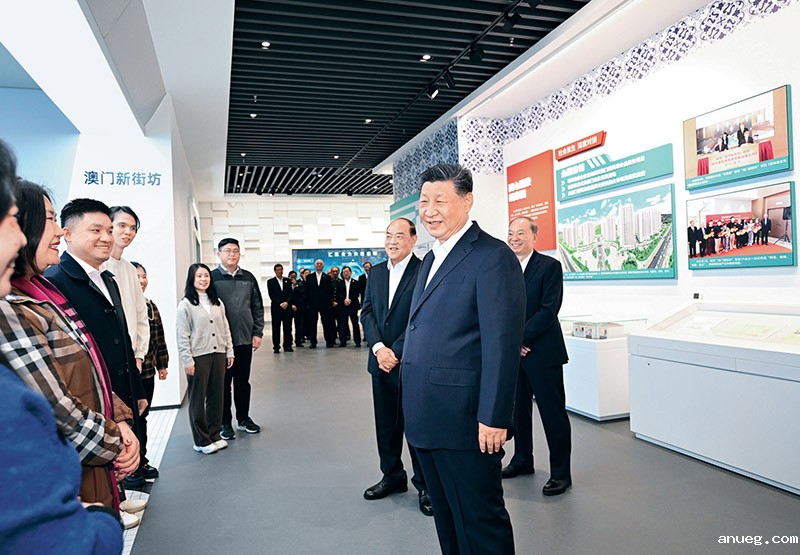 2024年12月19日上午,中共中央总书记、国家主席、中央军委主席习近平在澳门特别行政区行政长官贺一诚陪同下,来到横琴粤澳深度合作区考察。这是习近平在横琴天沐琴台展示厅澳门新街坊项目展区前,同居住在这里的市民代表亲切交谈。 新华社记者 燕雁/摄